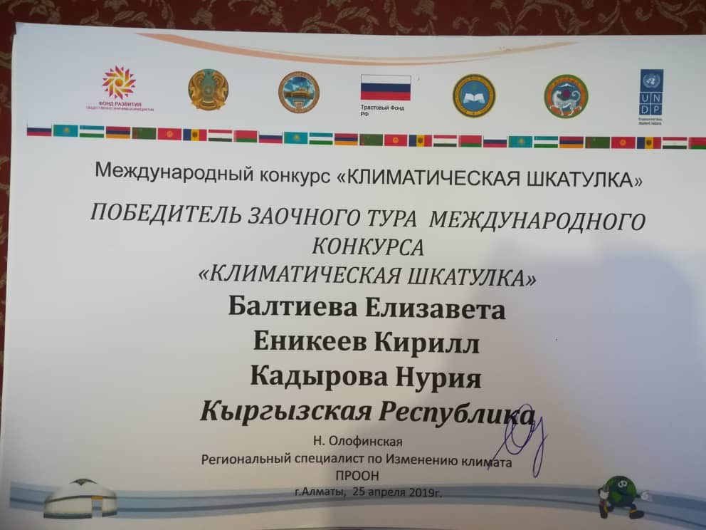 Школьники Кыргызской Республики приняли участие в Международном конкурсе проектов по проблеме изменения климата. Он проходил в г. Алматы (Республика Казахстан) в рамках проекта программы развития ООН «Климатическая шкатулка».